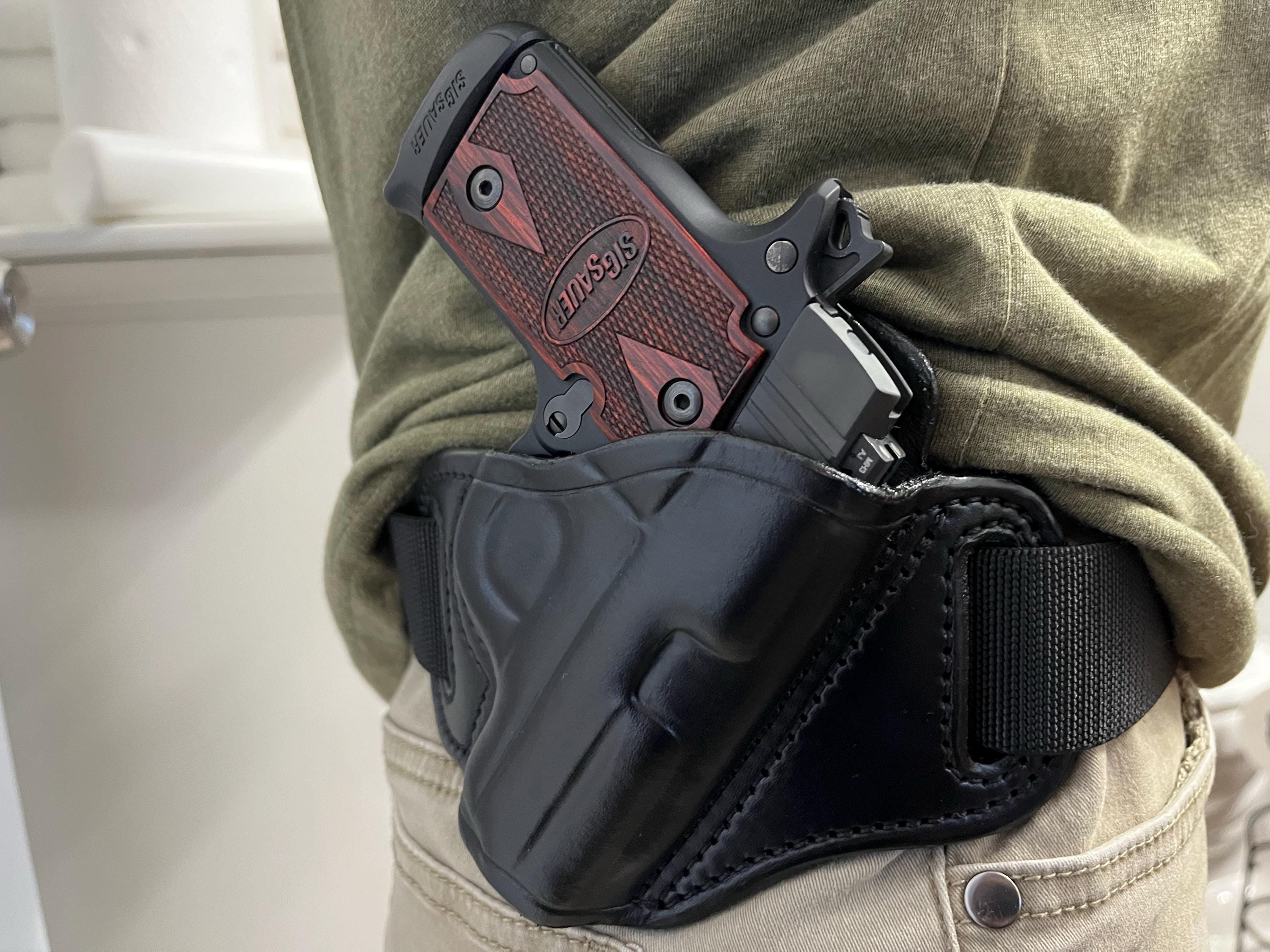 - Handcrafted leather pancake-style pistol holster that is made to order.