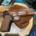 - Handcrafted leather pancake-style pistol holster that is made to order.